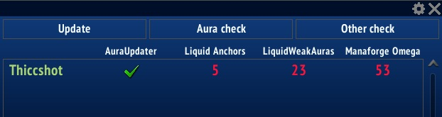 In game, type /au or click on the AuraUpdater icon on your mini-map to open the addon. You will see a blue screen with three options at the top. Click on Aura Check in the middle and it will display what, if anything, is out of date.