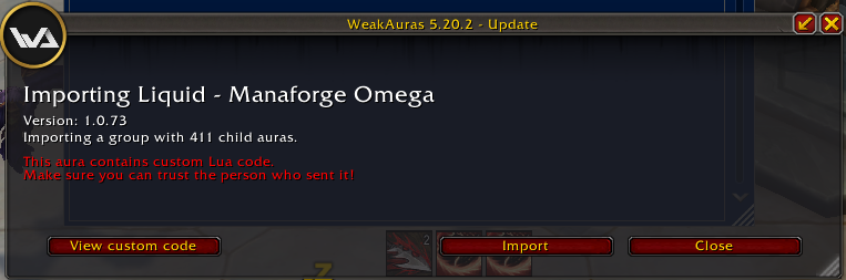 Once you have confirmed AuraUpdater is up-to-date, open the menu in game again by typing /au. Click on Aura Check in the middle and look under the Liquid Anchors, LiquidWeakAuras and Manaforge Omega colums. If you see red numbers, your auras are out of date. Click on “Update” at the top left and go down the list, clicking update. Every time you click update the WeakAura addon will pop up – press “Import” at the bottom to update.