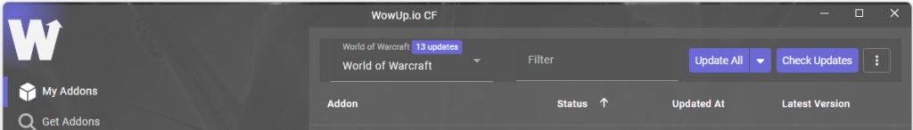 If there is a checkmark under AuraUpdater then proceed to the next steps. If AuraUpdater is out of date, you need to open up the WoWUp.io app, in the left menu click on “My Addons” then “Check Updates” in the top right corner and update the AuraUpdater addon and TimelineReminders addon as needed. Once updated, click on “Check Updates” again as sometimes multiple versions need to be installed sequentially. During RWF, sometimes there are updates being pushed out hourly – this is expected to level out within a few weeks.
