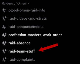 In the Blood Omen Discord, navigate to the Raid-Team-Stuff chat channel and open the pinned messages by clicking the pin in the upper right hand corner.