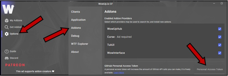 - Check WoWUp.io and ensure that you have a Personal Access Token entered. (Options > Addons > Look in the lower right corner). If you see a bunch of asterisk “***************” then you have a code entered. If you see a blank field, go to Discord and grab the Personal Access Token as described in Step 2 above.