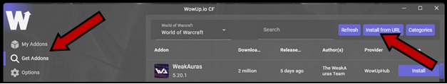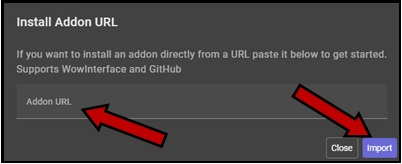 Open the WoWUp app. Click on “Get Addons” then “Install from URL”, paste one of the URL’s and click “Import”.