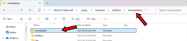 - Sometimes when you unzip a file to a directory, it makes a duplicate folder inside of itself. Example: The folder may unzip as AddOns\AuraUpdater\AuraUpdater\ and then put the files here. If this happens, click on the duplicate folder and drag it into the parent folder.