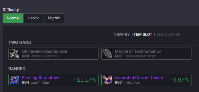 To check if your list is updated, below the field where you put your URL you can click on “Normal” and “Heroic” to see a list of items and their relative % increase (or decrease!) to your damage. If all the items are grey – it means your SIM URL is missing. You need to do this every raid day before raid starts so that the information is the most up to date.